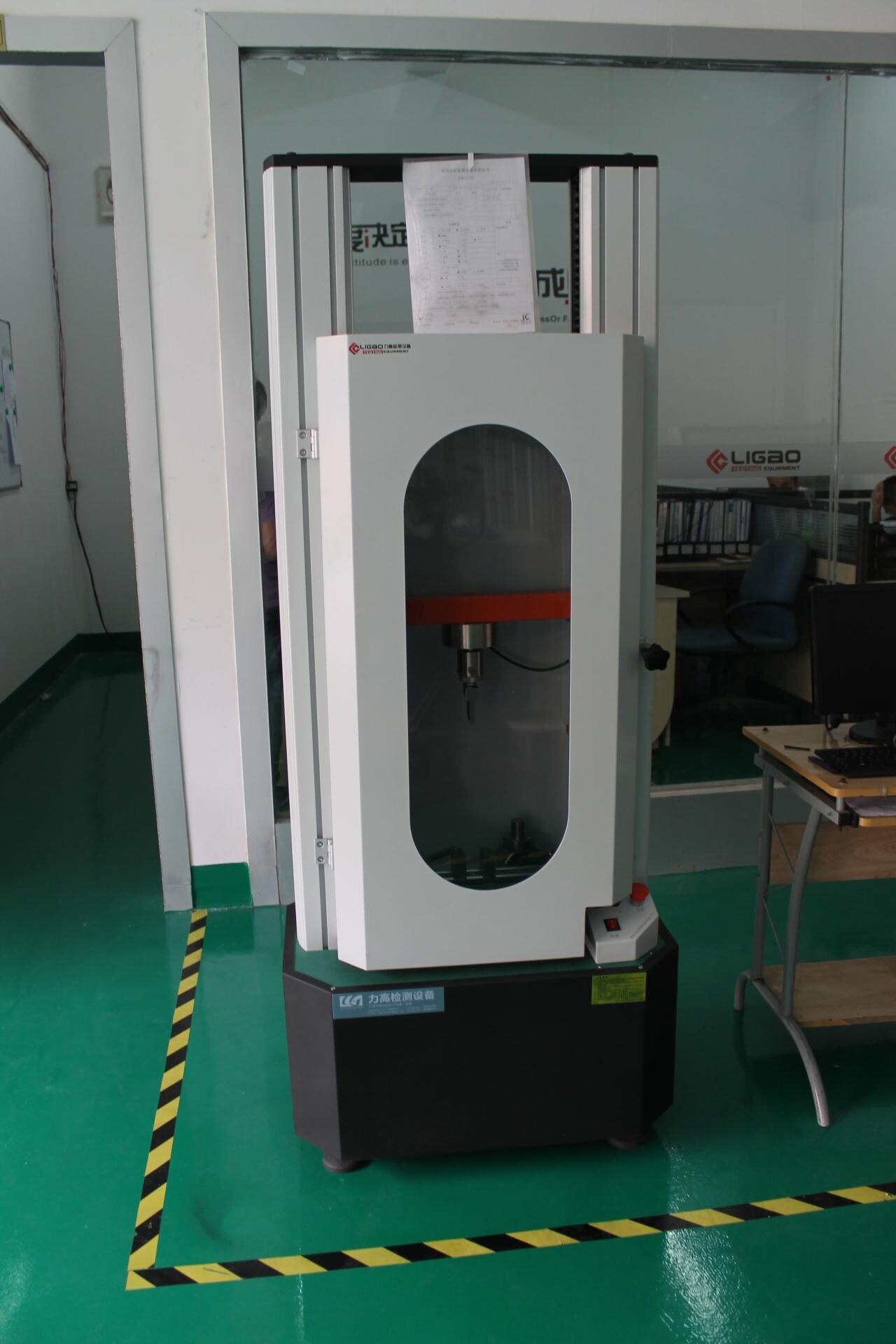 1、拉力試驗(yàn)機(jī)的力量值校正:進(jìn)入計(jì)算機(jī)程序后于打開校正界面,按測試開始,取一標(biāo)準(zhǔn)重量砝碼輕掛于上夾具連接座,記錄計(jì)算機(jī)顯示力量值,并計(jì)算與標(biāo)準(zhǔn)重量砝碼之差,誤差應(yīng)不超出±1%。